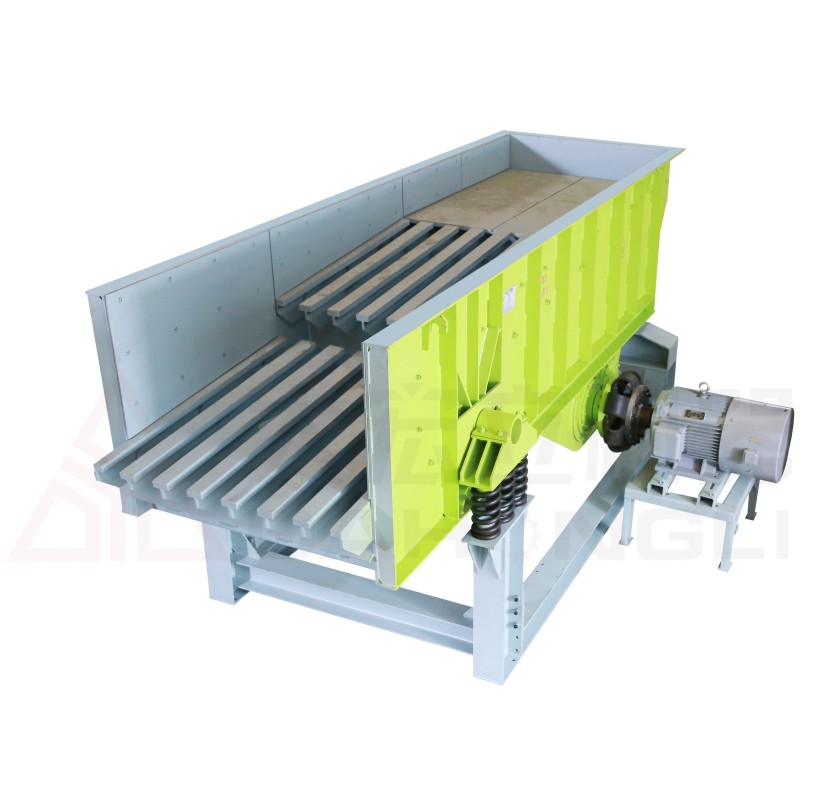 ZSW系列振動給料機是由料槽體、激振器、彈簧支座、傳動裝置等組成,槽體振動給料的振動源是激振器,激振器是由兩根偏心軸(主、被動)和齒輪副組成,由電動機驅動主動軸,再由主動軸上的齒輪嚙合被動軸轉動,主、被動軸同時反向旋轉,槽體振動,使物料連續不斷流動,達到均勻給料及粗篩分的目的。